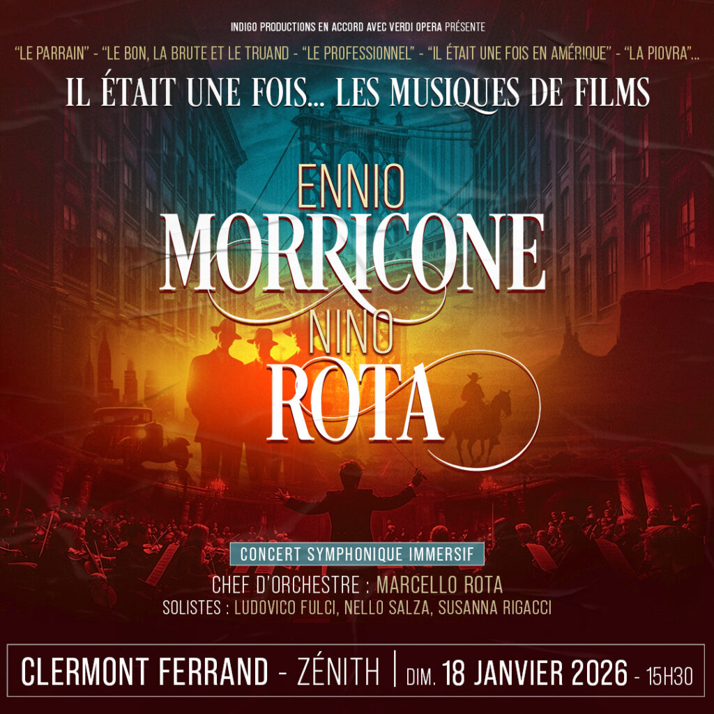 Ce concert symphonique immersif propose un voyage sensoriel unique, où musique, lumière et image se rencontrent pour sublimer les œuvres d’Ennio Morricone et Nino Rota. Sous la direction de Marcello Rota, chef d’orchestre de renommée internationale et neveu de Nino Rota, les célèbres solistes Nello Salza (trompette), Ludovico Fulci (piano) et Susanna Rigacci (soprano), qui ont collaboré pendant plus de 30 ans avec Ennio Morricone avec plus de 500 concerts à travers le monde, interprètent des pièces magistrales du répertoire. Vivez les moments clés de leurs carrières exceptionnelles à travers les musiques de films de Sergio Leone (Le Bon, la Brute et le Truand, Il était une fois dans l’Ouest ...), Francis Ford Coppola (Le Parrain …) ou encore Federico Fellini (La Strada).